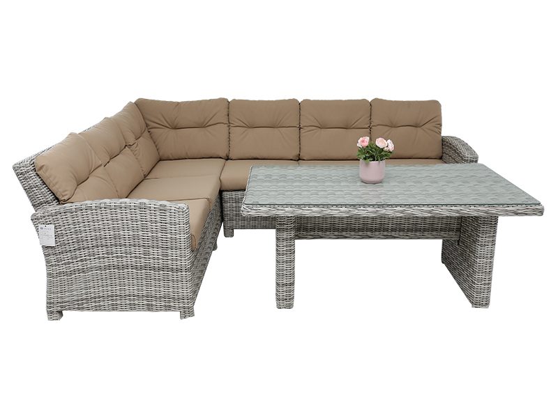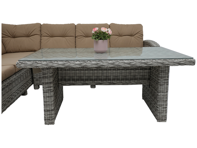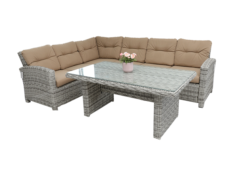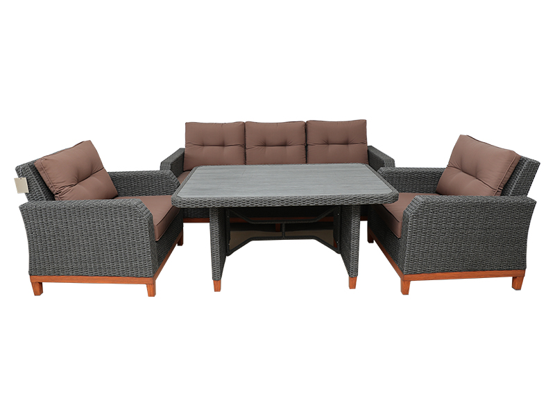 Alumíniumcső félkerekes pe rattan, 10 cm -es üléspárna szivaccsal és 10 cm -es hátsó párnával, rost töltelékkel, 230 g szövet; Háromüléses szék: L80*W190*H77CM, 1 PC; Single Armrast 3 üléses szék: L80*W160*H77CM, Amrest kd, 1pc; Táblázat: L140*W80*H63cm, 5 mm -es edzett tiszta üveg, KD, 1dc | 142.5*18*83cm/egy asztal egy kartonban; 192*99*83cm/mások egy kartonban | 36SETS |